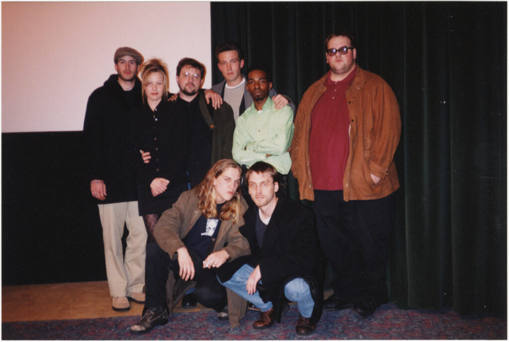 The cast and crew of Chasing Amy, which premiered at the 1997 Sundance Film Festival. Clockwise from right: Ethan Suplee, Mosier, Jason Mewes, Jason Lee, Joey Lauren Adams, Smith, Ben Affleck, and Dwight Ewell.