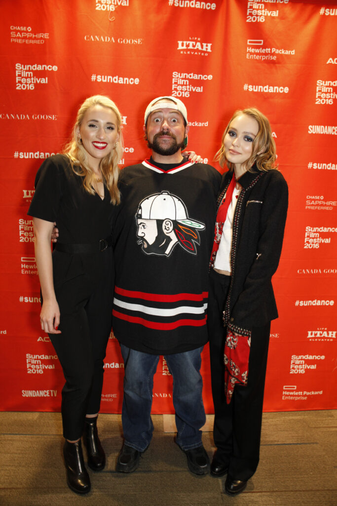 With his eyes wide, Smith stops to be photographed with Yoga Hosers cast members, daughter Harley Quinn Smith (left) and Lily-Rose Depp (right), ahead of the film’s premiere at the 2016 Sundance Film Festival.