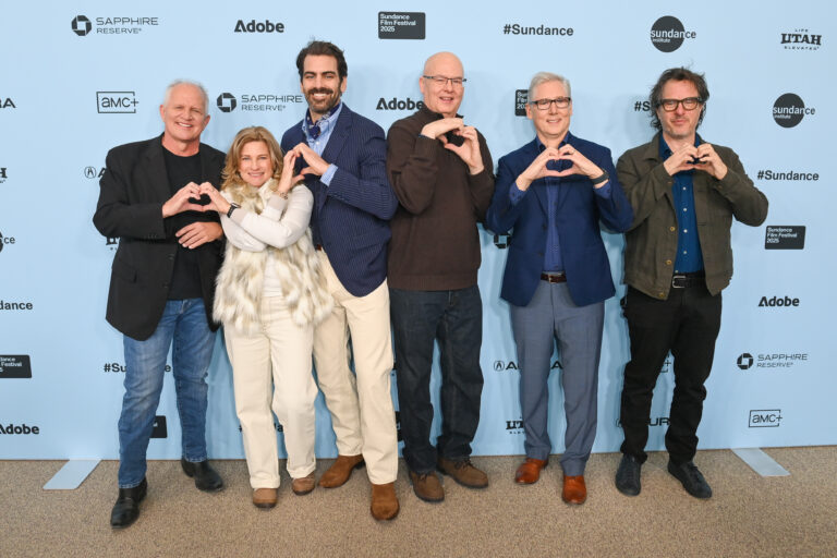 (L–R) Jeff Dutemple, Rachel Raimist, Fred Isseks, Amanda McBaine, Jesse Moss, David Birmingham, and Mike Regan attend the 2025 Sundance Film Festival premiere of “Middletown”